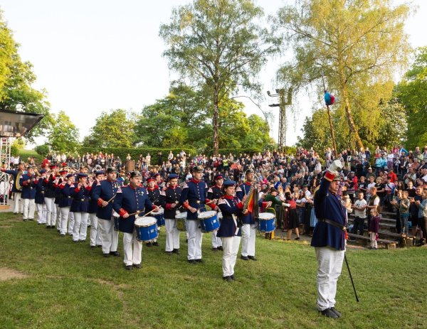 Im Schlosshof stehen nun die große und die kleine Bühne, die Festivalküche, die zweistöckige Absinthbar, der Sanitärtrakt, die Feuerstelle und die Mittelaltertaverne mit begehbarer Plattform. Hier brennt das große Feuer. Hier gaukeln die Gaukler. Hier lernen sich die Paradiesvögel kennen.